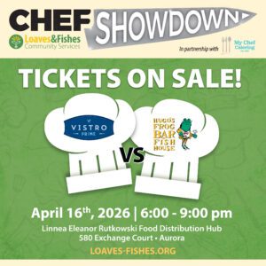 Big smiles, sizzling food, and funds raised, were the main ingredients of the Chef Showdown, “Battle of the Champions” on the evening of Wednesday, March 9, at Loaves & Fishes new Food Distribution Hub at 580 Exchange Court, Aurora. The event was held in partnership with My Chef Catering raising funds for essential services for struggling families in DuPage, Kane, Kendall, and Will counties.