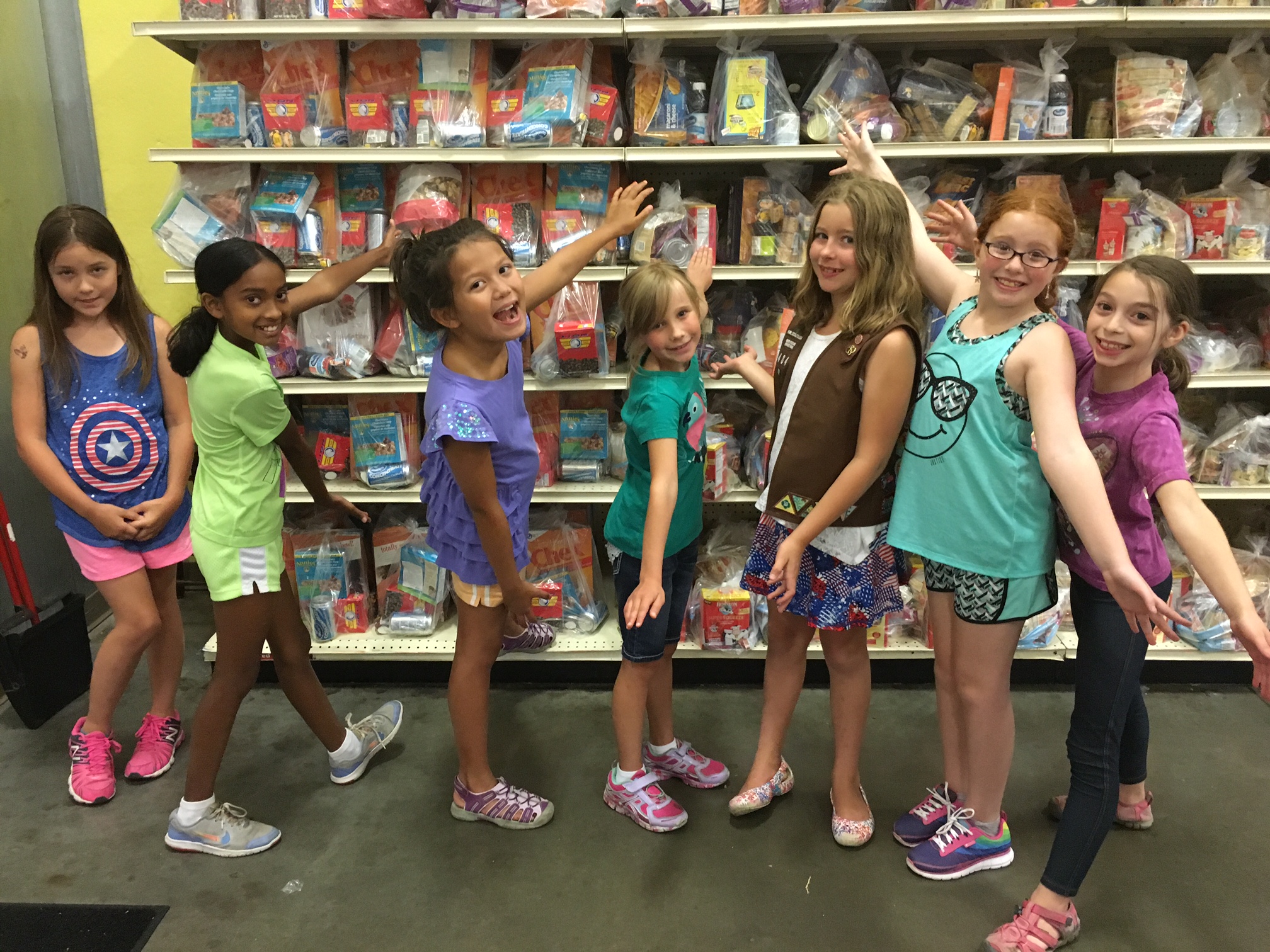 The Brownies are now led through the grocery market by the Lias, stopping along the way to learn some fun facts about Loaves & Fishes and the services the organization offers. At one point, Patrice selects girls to represent Proteins, Grains, Fruits, Vegetables, and Dairy, as she delivers a lesson on nutrition and discusses how the girls can make smart food choices of their own. The girls proceed to the warehouse where they are given instructions on how to assemble the Child Nutrition bags that they saw in the grocery market. The “work” begins, yet the energy among the Brownies suggests that this somewhat repetitive task is viewed more as a lively game of “how many people can we feed?” Patrice and Jim encourage the group to enjoy their time while using every opportunity to teach about food insecurity.