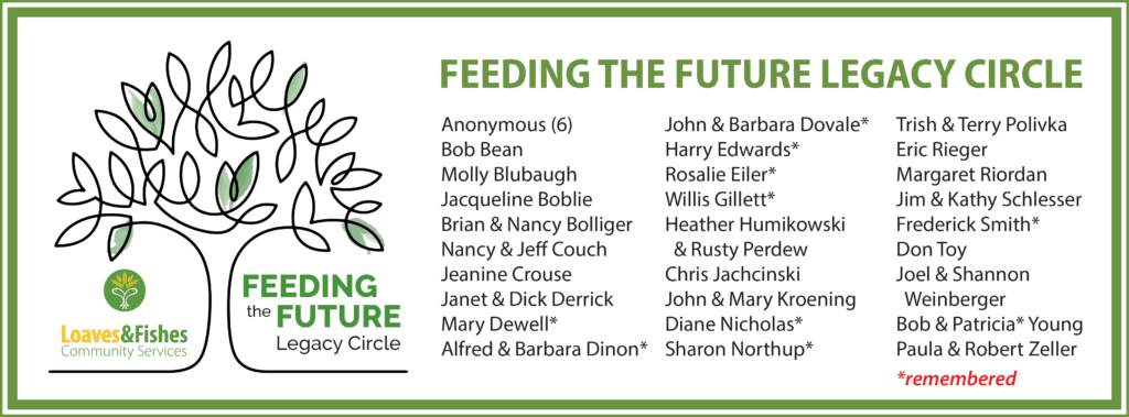 There are numerous ways to make a legacy gift; see below for some of them. When you indicate your intention to us, you will become part of our Feeding the Future Legacy Circle. This generous group has indicated that a planned gift will eventually be made to Loaves & Fishes. All of us are forever grateful for the generosity and foresight of those in the Feeding the Future Legacy Circle.