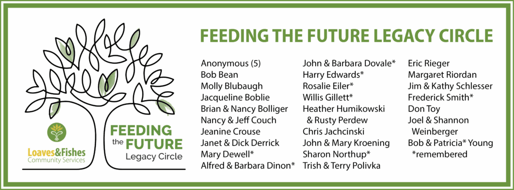 There are numerous ways to make a legacy gift; see below for some of them. When you indicate your intention to us, you will become part of our Feeding the Future Legacy Circle. This generous group has indicated that a planned gift will eventually be made to Loaves & Fishes. All of us are forever grateful for the generosity and foresight of those in the Feeding the Future Legacy Circle.